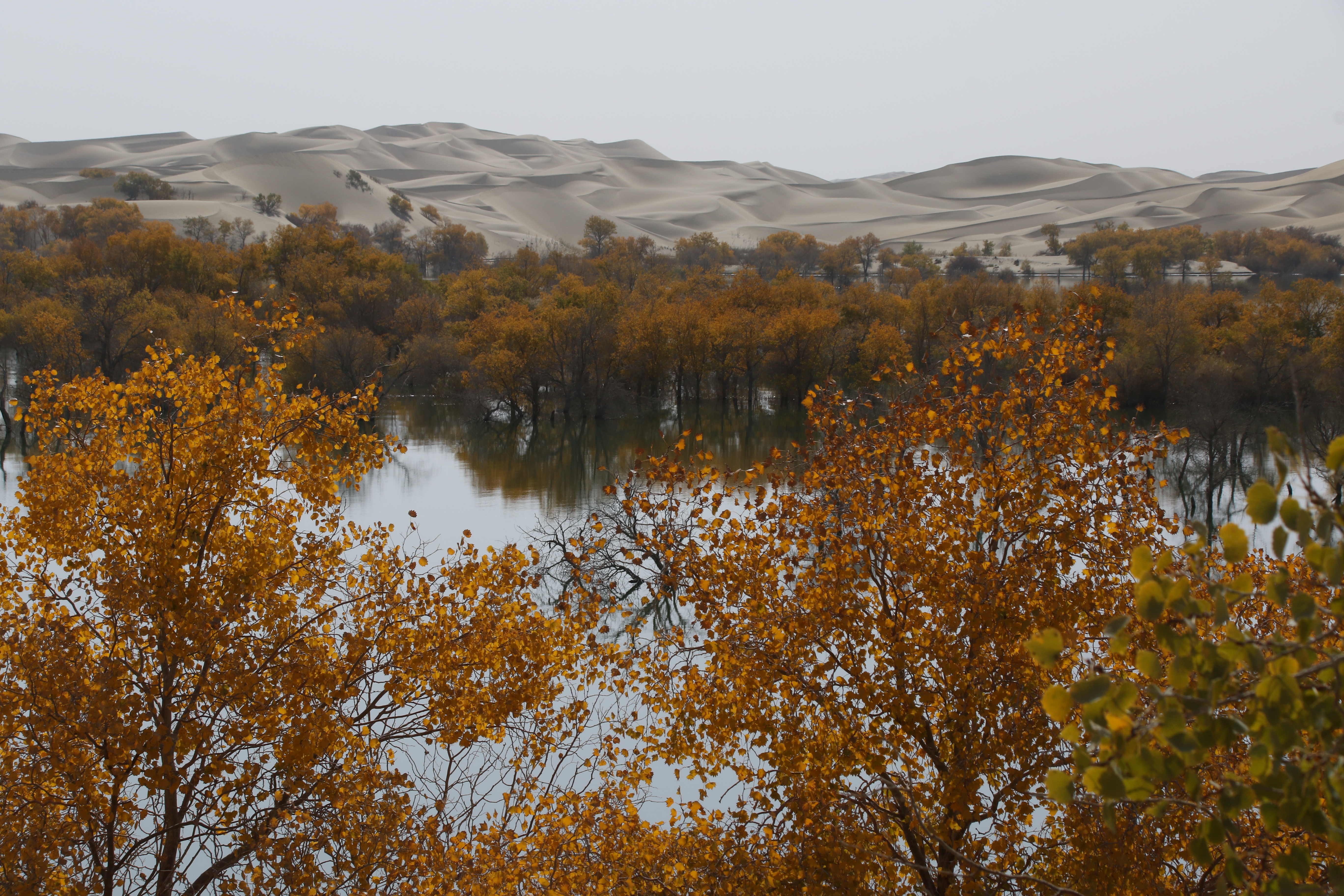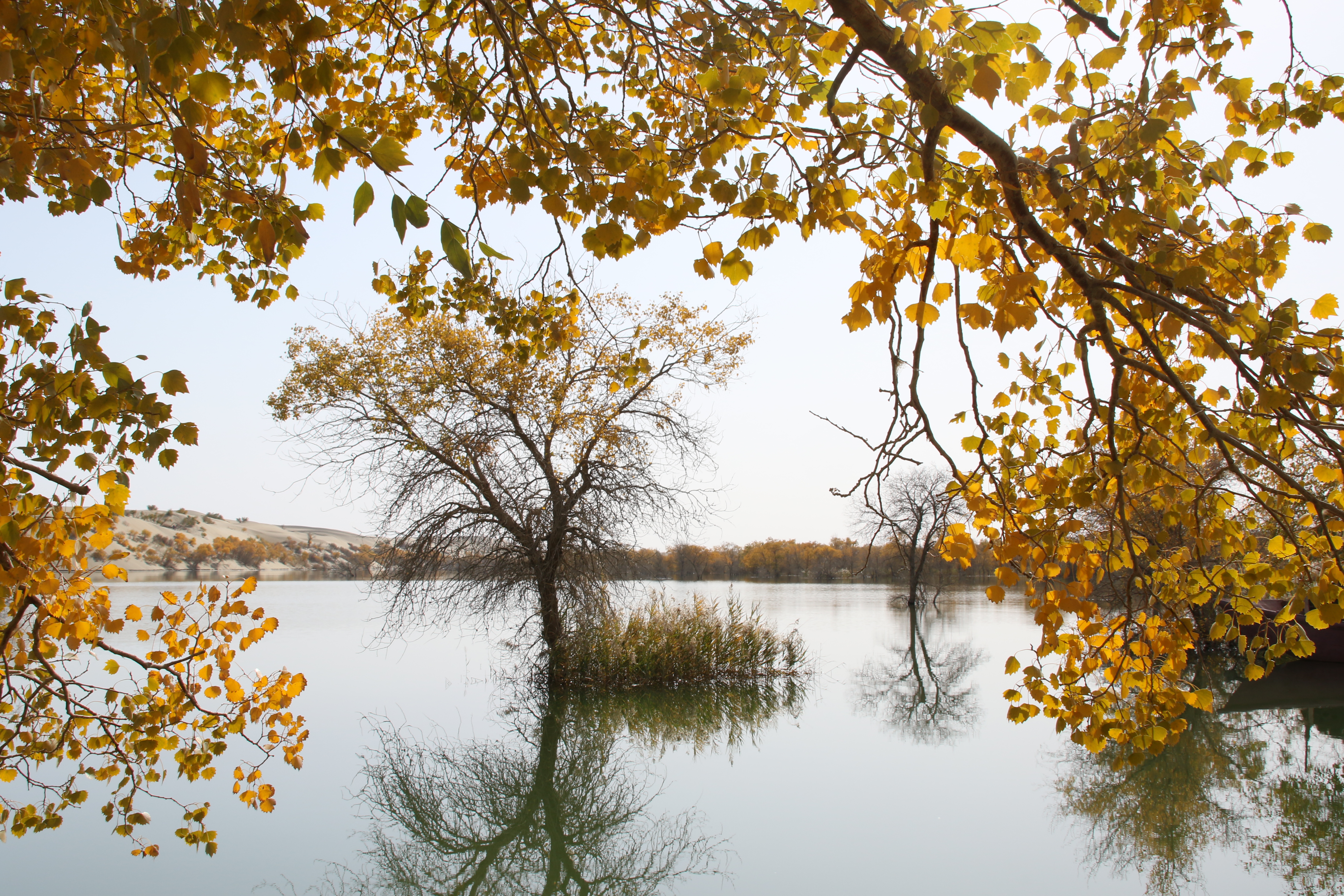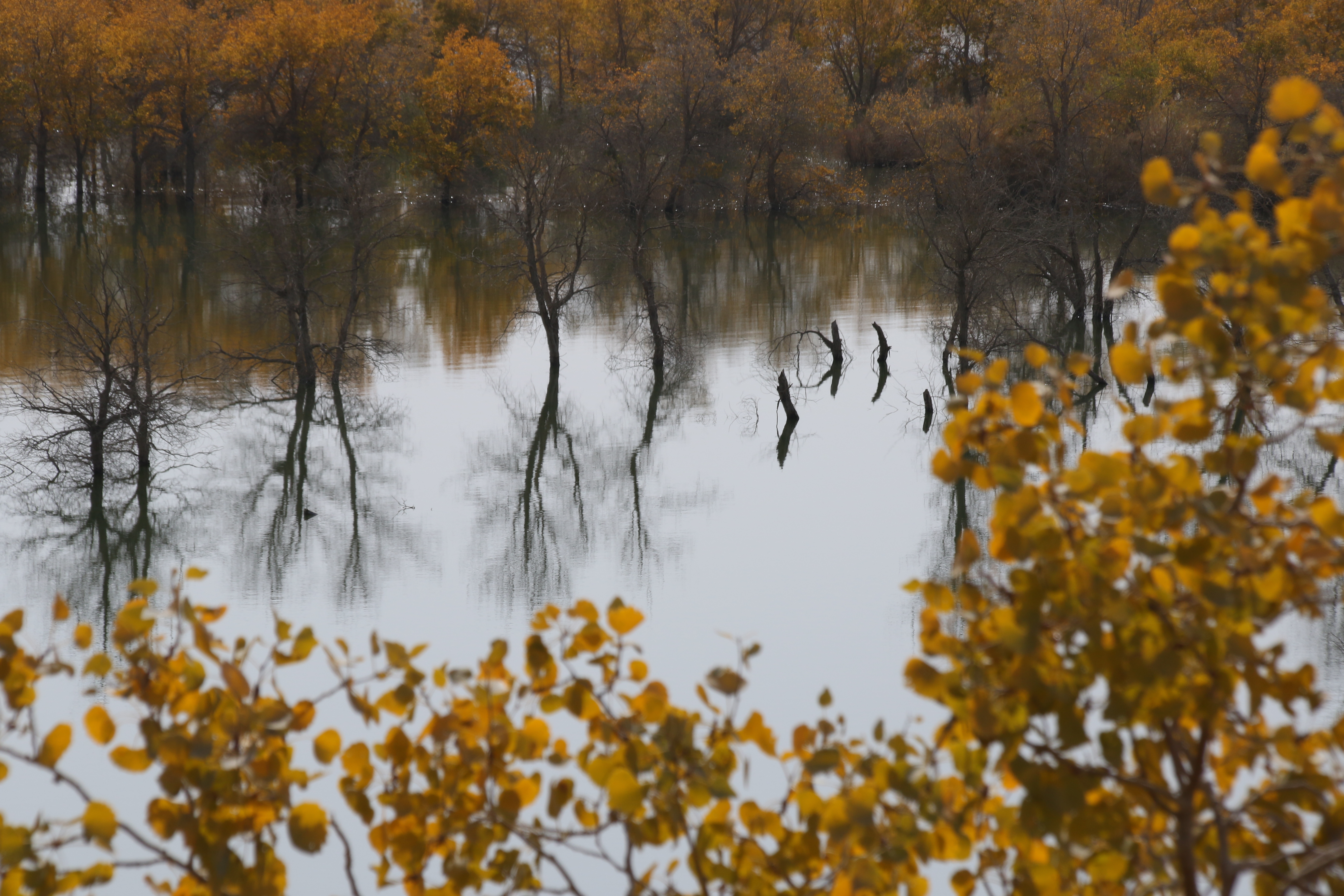 拍完金黃沙漠胡楊水岸大景、胡楊枯幹倒影,再將鏡頭穿越耀眼陽光下之金黃胡楊葉子,對焦中間空隙如鏡寧靜水面之胡楊枯幹或倒影,冀望金黃濃淡不一能有些意境,當不成攝影大師,自娛也。