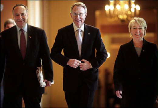 畫面中間是即將上任的參院多數黨領袖 Harry Reid 。右邊是華盛頓州參議員 Patty Murray 。 Murray 原任民主黨參院黨團助理總召, 110 屆新國會 Murray 將出任民主黨參院兩黨協商小組 ( Senate Democratic Conference) 秘書長,為民主黨參院黨團第四號人物。左邊是紐約州參議員 Charles Schumer 。期中大選 Schumer 領導民主黨參院競選委員會 (Democratic Senatorial Campaign Committee , DSCC) ,輔選成功表現卓越,大選後, Schumer 答應連任民主黨參院募款委員會 (the Senate Democratic fundraising committee) 主任一職,為 2008 年選季籌募金彈,民主黨還特別在參院兩黨協商小組新創「副主席」一職,以資犒賞,為民主黨參院第三號人物。