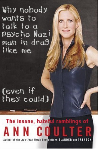 Coulter的「傻」,傻的有名。右派早已有很多各式各樣有自己傳播通路的 well established commentators,對也想闖名號的Coulter 是不容易。她就缥竊各家特色,可又學得不像,最後就以穿得極少或極怪、在電視鏡頭上自戀愛嬌(她是真得對鏡頭拋媚眼) 、或評一些自己根本無法或不夠格評論的問題、還愛虧人、自誇是保守派評論家出書最多者。可是呢,容貌穿著上的自我表現,被人一眼看穿視為膚淺,虧人講笑話,又常是冷笑話,評 social issues 如 family value 道德警察等等,又因自己未婚卻一堆亂七八糟的私領域問題,而被反批偽善,她的書有人翻但內容乏善可陳。自認自己是保守派的評論標竿,保守派的硬底評論家還不屑與之為伍。