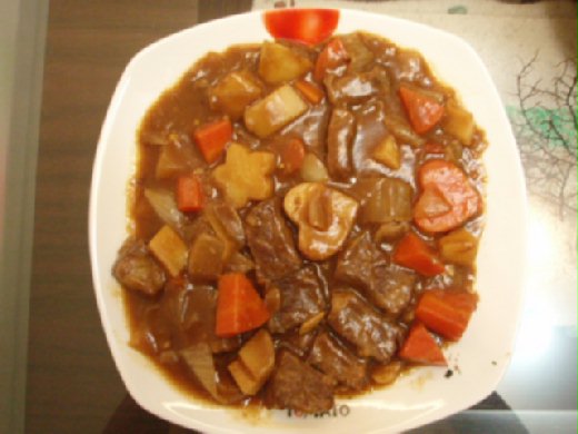 將洋蔥、蒜頭與牛肉塊下鍋爆香,加入備用的紅蘿蔔、馬鈴薯拌炒過後,加一杯水後再加入市售咖哩塊(視分量而決定咖哩的量,一般市售咖哩的外包裝都會教人適量的加咖哩塊),熬煮至咖哩融化後,湯汁變濃稠後即可。
