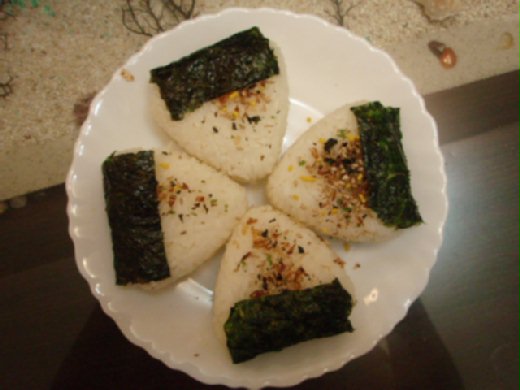 『三角飯團』:一般大賣場都會賣模型,只要將煮好的飯加入模型中,用力壓型即可,取出三角飯團後再貼上一片海苔,灑些香鬆,就很有專業的賣相了。