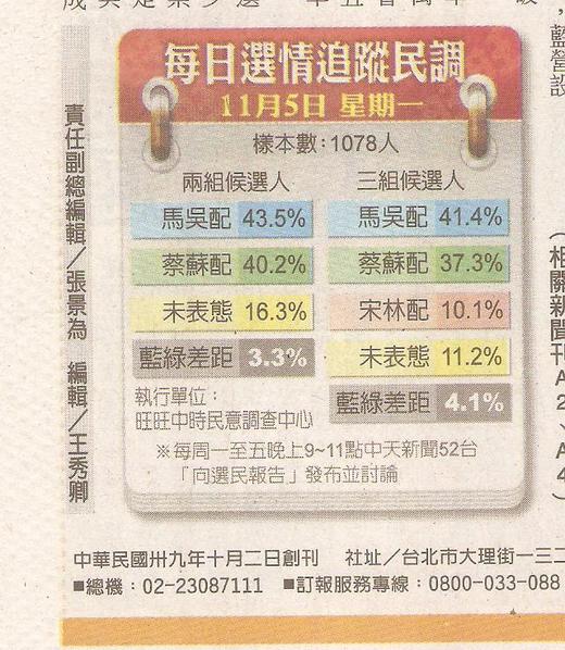 2012年總統大選中國時報每日追蹤民調 宋楚瑜參選 馬英九減少2.1% 蔡英文減少2.9% 藍綠差距由3.3%變成4.1%