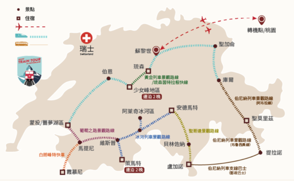 瑞士是令人嚮往的旅遊天堂,好山好水,此行參加華友旅行社的"瑞士火車 六大名峰13日"旅行團,連同領隊共22人,搭火車、公車、纜車、船及步行方式取代以遊覽車為主的旅程,加上不少餐食自理,以"類自助旅行"方式順時鐘繞行瑞士一圈,紀錄一下此次行程: