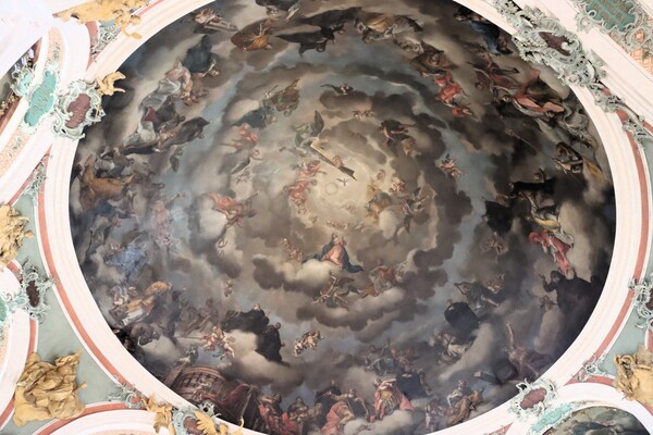 > 主座教堂內部相對素潔,天花板有彩繪,受羅馬的影響,窗台簡潔通透