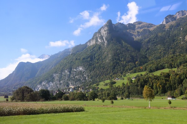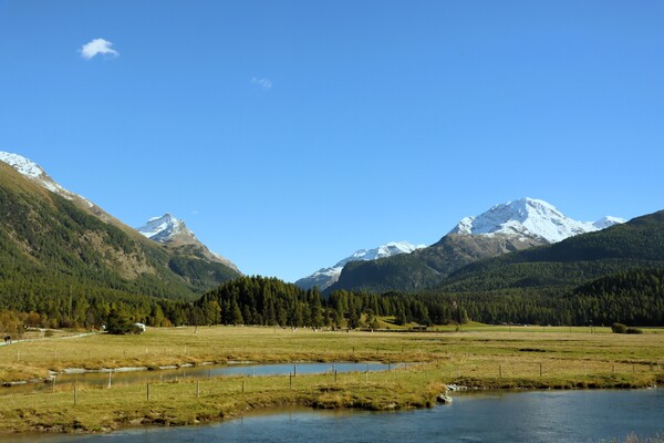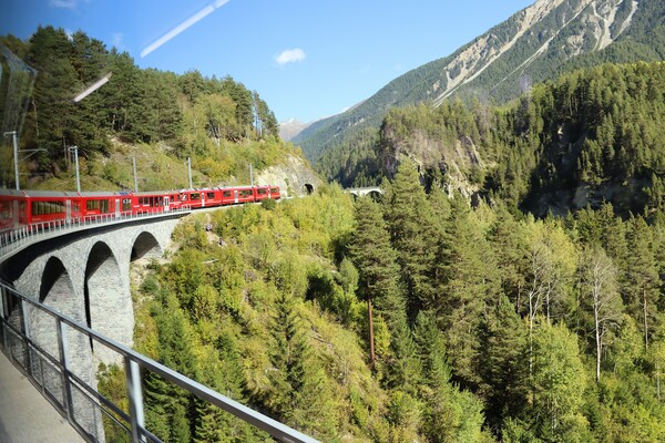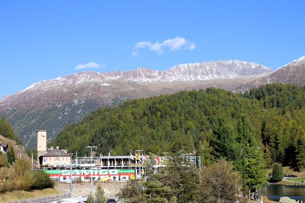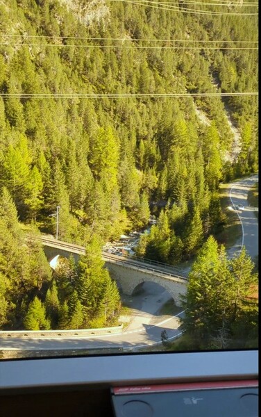離開St.Gallen繼續搭瑞士國鐵到Sargans 轉 local train 到Chur 轉冰河列車到St.Moritz。在往Sargans的鐵路是沿著萊茵河的上游而行,東側就是Liechtenstein 列支敦斯登這個小國,這也是此行第一次見識到瑞士河谷的美麗。從Chur到St.Moritz的這段鐵路是屬於Bernina Express的區段,開始行駛在山谷之間,好幾次的盤旋上山,通過著名的藍德瓦薩橋(Landwasser Viaduct),可惜天氣太好,車窗玻璃反光太強,無法拍出好照片! 後續的行程,列車車窗都可以打開,就沒這個問題了,這也是導遊說搭冰河列車沒比較好的原因(藉口),我愛拍照,能開窗才是對的選擇。