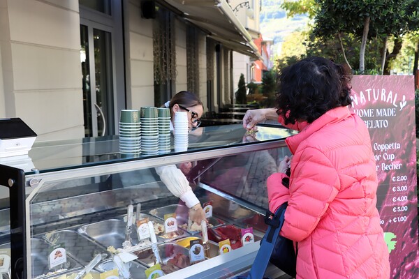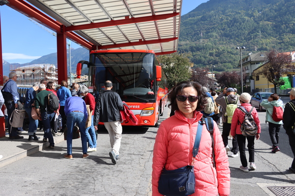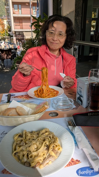 Tirano,義大利正北方與瑞士接壤的一個小鎮,不到一萬人口,是窄軌的瑞士Bernina Express跟標準軌的義大利火車轉接的車站,成了不少遊客匯集的地點。今日午餐自理,車站附近餐廳林立,找一家義大利餐廳,吃到一餐感覺很道地的義大利麵,十歐元很實惠,而這裡的義大利冰淇淋是絕對不能錯過的,店家很用力的輾挖冰淇淋,一大球才兩歐元,每加一球加一歐,非得給它吃飽不可,過了這站,以後的冰淇淋都是4瑞士法朗起跳,又沒這裡好吃!