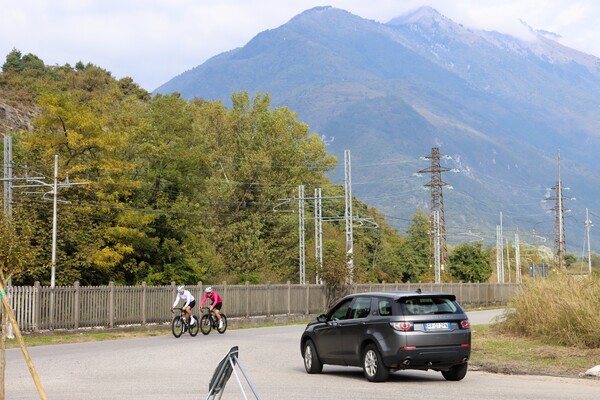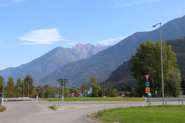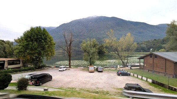 午後,搭乘掛著 Bernina Express的巴士取代火車運行,成了"類火車",沿著義大利境內的阿爾卑斯山谷往Lugano西進,義大利的村落建築比較密集,經常跟鐵路平行的公路只有兩線道,有幾段上了高速公路,在接近Como湖前的一處交流道休息上廁所 (Trivio Fuentes),看見雲裡出現霓彩,在義大利連自行車都從登山車變成公路車了!