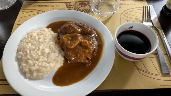 > 此行最受讚譽的牛膝加燉飯,旁邊搭配的是紅酒,不是咖啡喔!