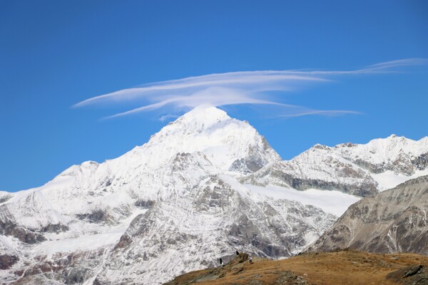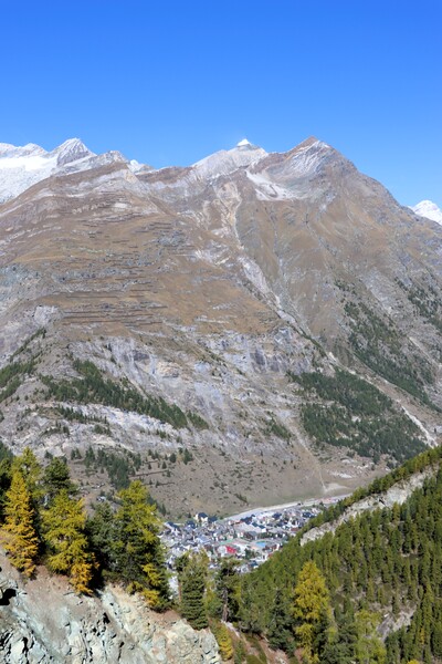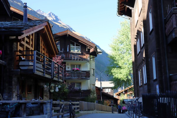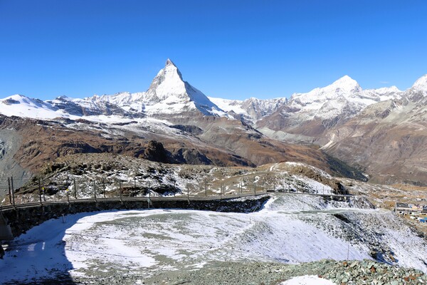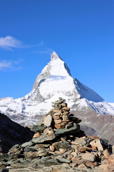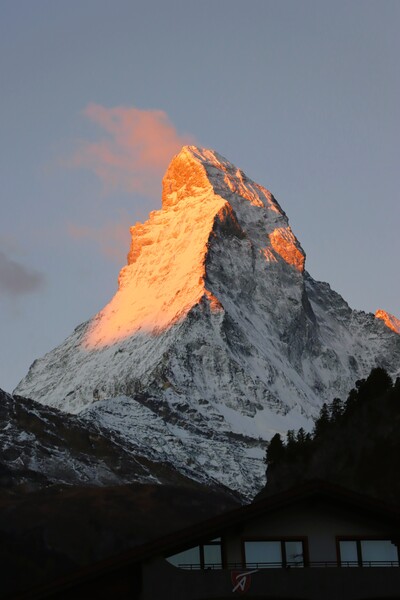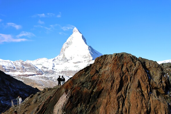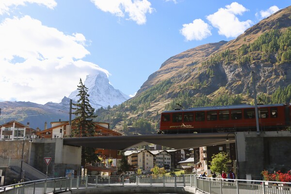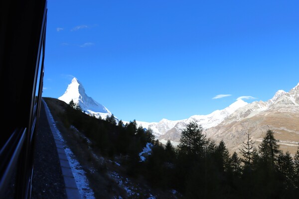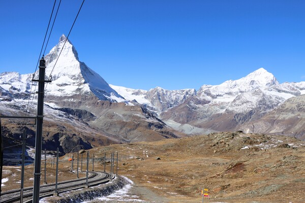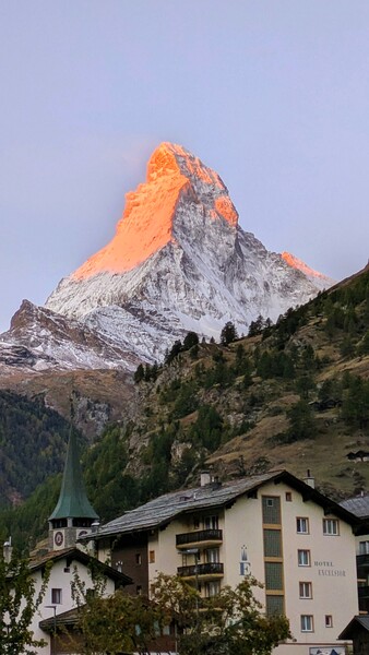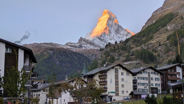 今日的行程就是馬特峰 (Matterhorn, 或稱馬特洪峰),標高4,478m,光突出的尖峰就有1,040m,獨一無二的馬特峰,一看就無法忘卻的馬特峰,全程辨識度最高的一座山峰,毫無疑問的第一名峰! 我們很幸運的從日出時的黃金馬特洪、晴空萬里的白皙馬特洪、到夜間透出微光的馬特洪,盡皆入袋,加上當日正是中秋節,度過一個幸福的策馬特之馬特洪日!