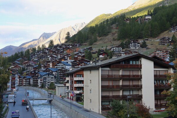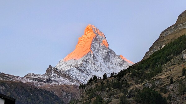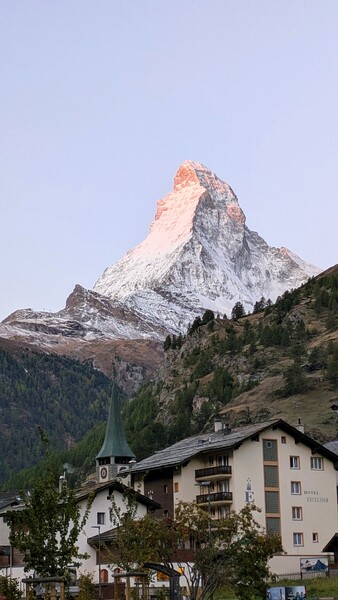 天剛亮,就在旅館附近,登山鐵路橋下的河畔,略冷的清晨,望著四面犀利陡峭的馬特峰,從漸白的天空中逐漸從灰白轉變成黃金色,日出的陽光剛好照射到如鏡面般的山壁,反射成金黃耀眼的獨立山峰,果真是世界奇觀!