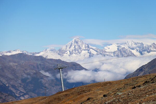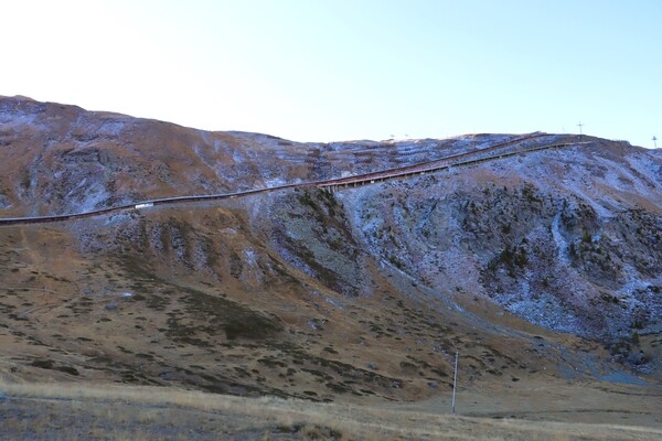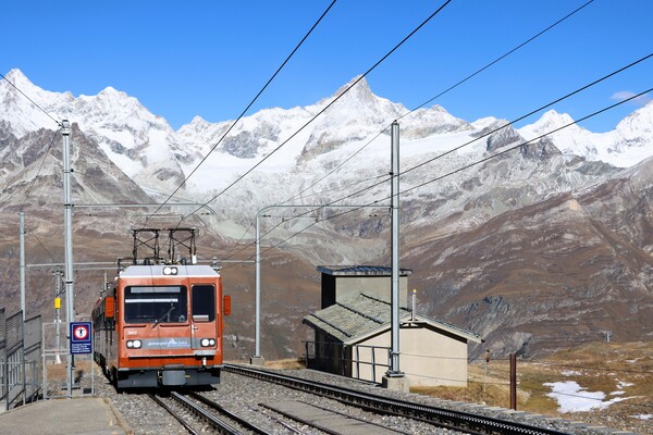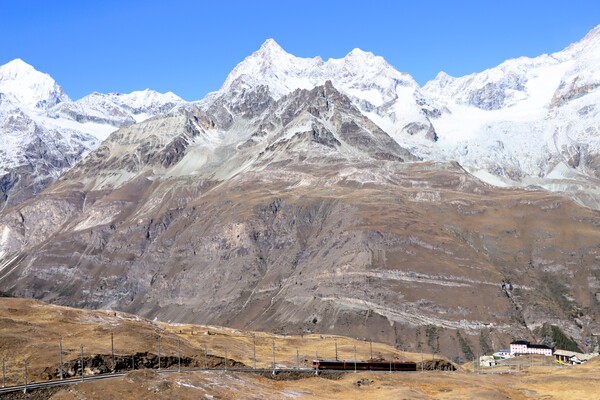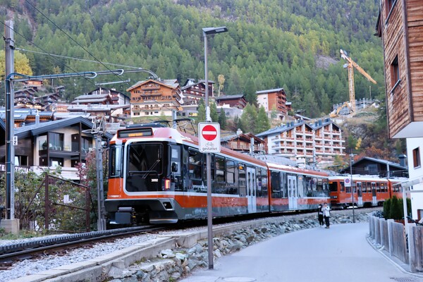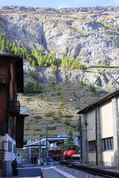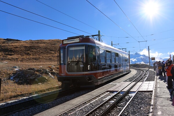 返回策馬特的路上,太陽照射角度上升,可以拍攝整個Gornergrat鐵路的美景! 登山列車一次開出兩列,後列似乎是高檔包車