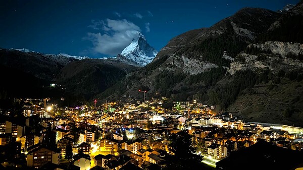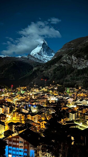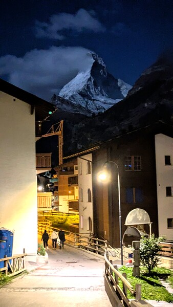 飯後,步行到山腰的觀景台看馬特峰及策馬特的夜景,也得爬個兩三百階才看到如此迷人的夜景,今晚可是中秋夜,月亮卻遲到半夜才登場,沒能跟馬特峰合體,可惜。