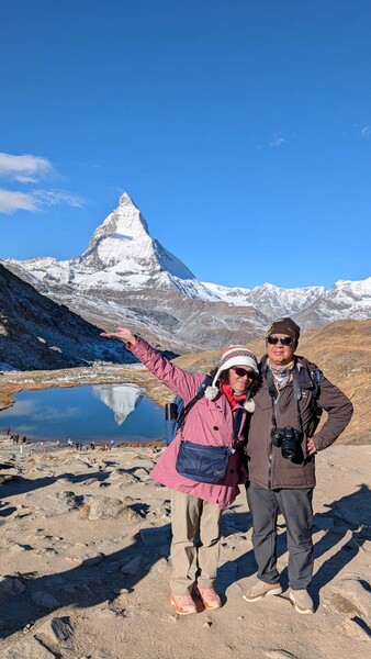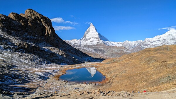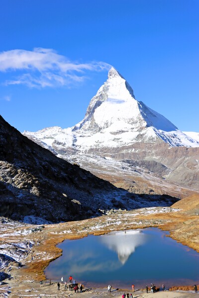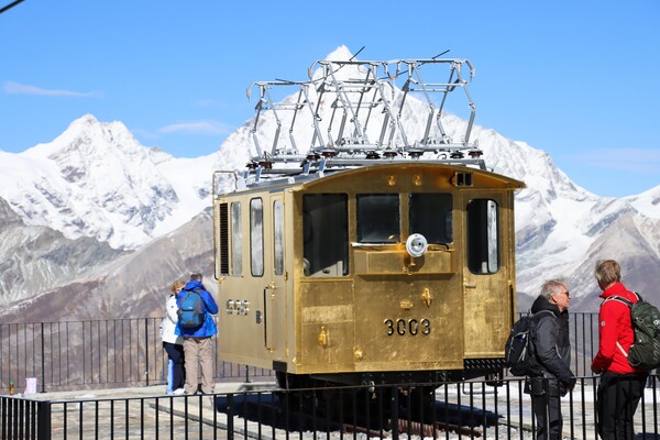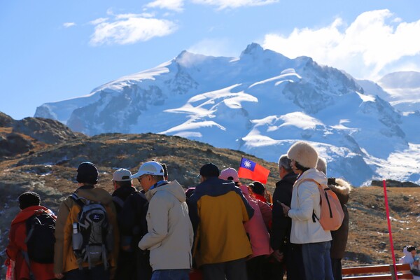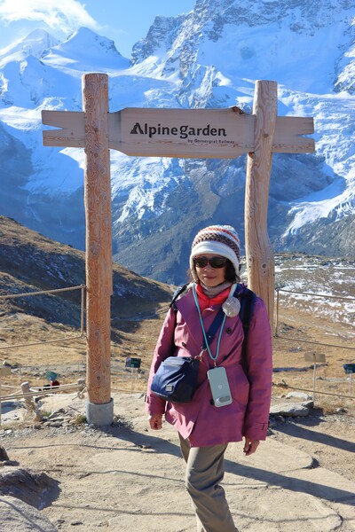 早餐後,到策馬特車站(1,620m)搭乘Gornergrat 鐵路的齒軌登山列車上山,旅行社有加購優先登車證,提前五分鐘上車,又可以開窗拍攝,一早就滿滿的人,列車繞行山區,路程不遠,一路馬特峰相隨在側,先到 Rotenboden 這站下車(2,815m),這站就近有一個小湖 Riffelsee 可以看馬特洪倒影,礙於高山行動遲緩,加上視力受損,沒有走到湖畔,還是可以拍到倒影,整個車站幾乎被台灣團佔領了,還有團帶國旗來攻佔馬特洪!