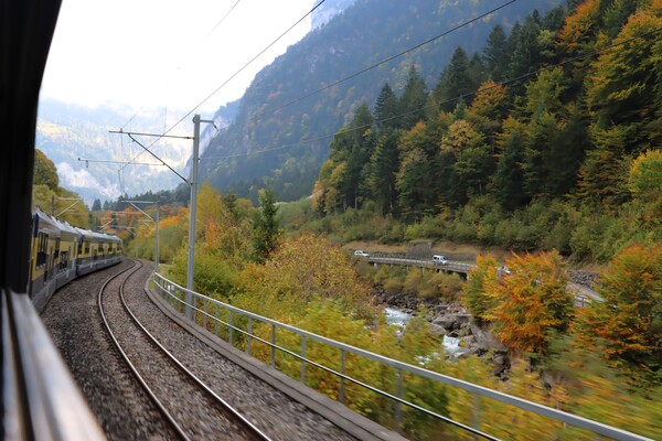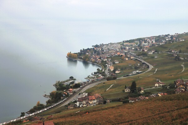> 列車離開湖畔,進入高原地區,湖畔還可以看到剛剛前往洛桑的鐵道及列車