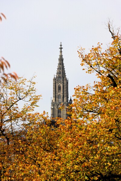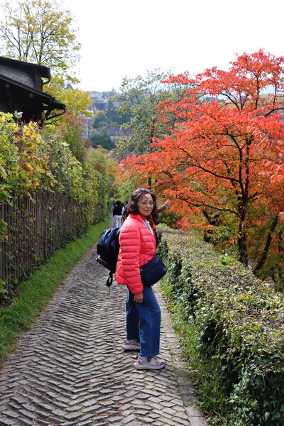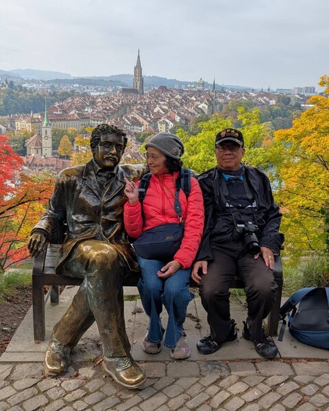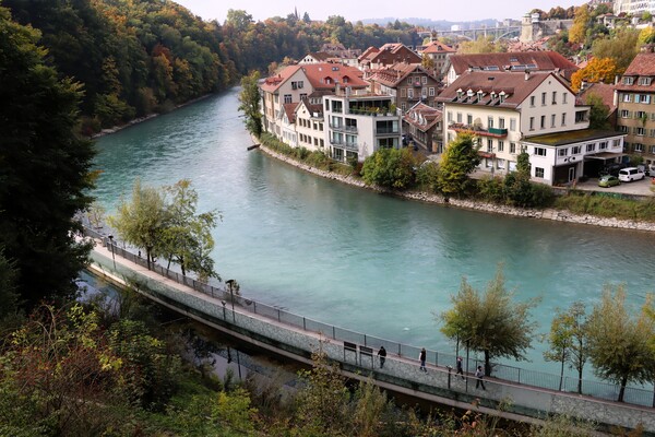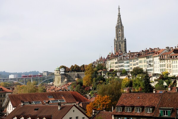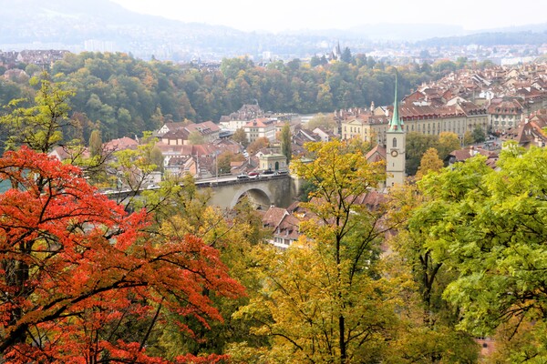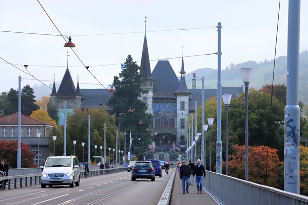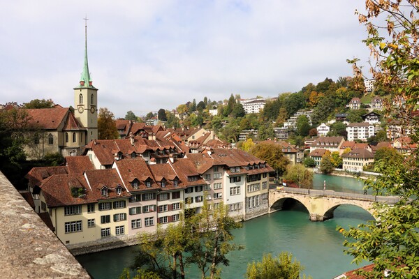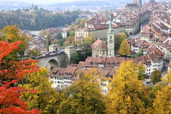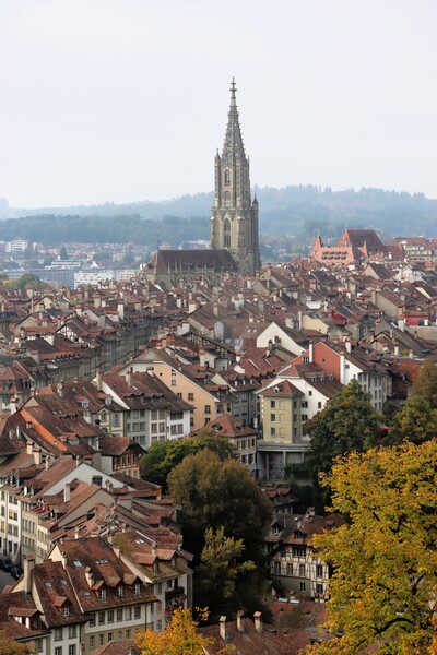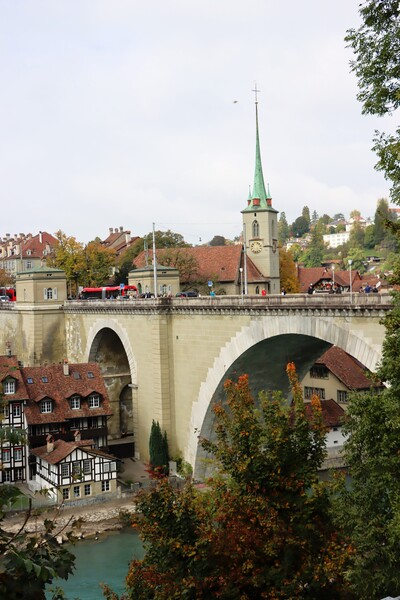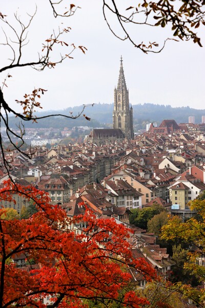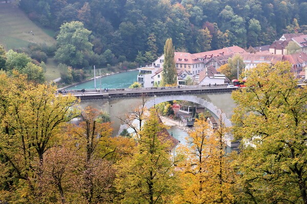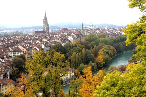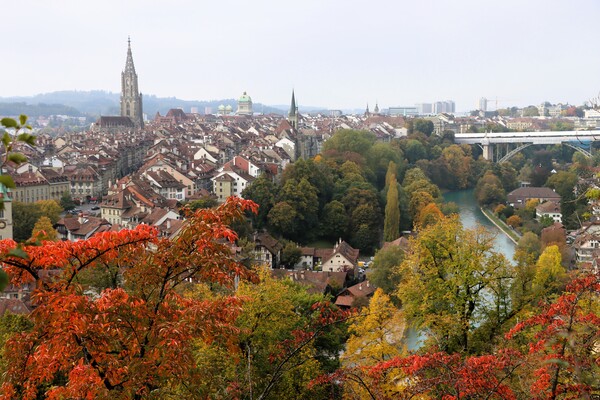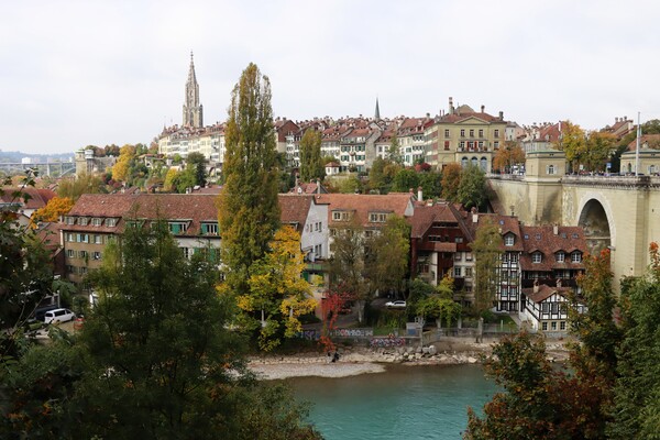 伯恩是瑞士的首都,第五大城,可能在紀元前就有人居住,城區被阿勒河(Aare)圍繞,河谷頗深,伯恩就像是在河畔的一塊大岩石上,抵達後,搭公車到阿勒河另一岸的玫瑰花園,這個季節玫瑰花不多,然而秋天的顏色卻讓整個阿勒河谷及伯恩城區顯得耀眼美麗,漫步到河谷,賞心又悅目。