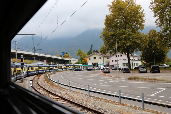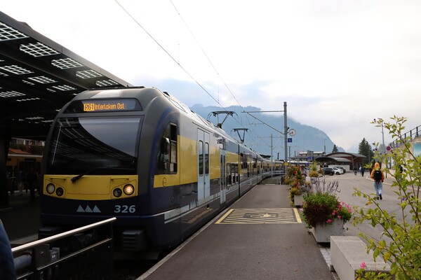 >在Interlaken換搭兩列串連的窄軌列車上山