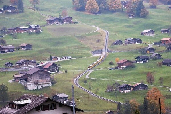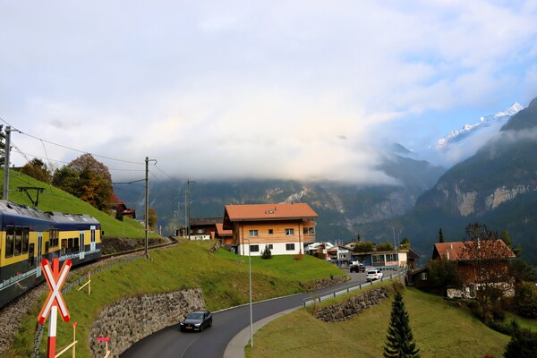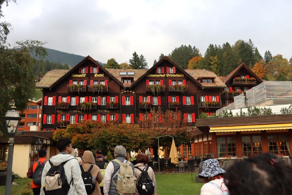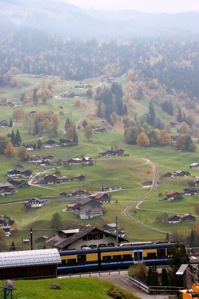 離開複雜的伯恩車站後,搭國鐵繼續在高原地帶行駛,抵達兩湖之間的 Interlaken,立刻轉窄軌列車前往Grindelwald,此列車是兩列串接,在Zweilütschinen分開,分別前往登少女峰的兩大據點 Grindelwald 及Lauterbrunnen,我們是到Grindelwald,在山間行駛時,已經接近黃昏,抵達Grindelwald時,乍見兩三座白大高山被壓在雲下,明天就是要上少女峰,今晚入住超級有意思又美麗的Romantik Hotel Schweizerhof,有斜向的電梯,如迷宮般的房間,超級景觀的露台!