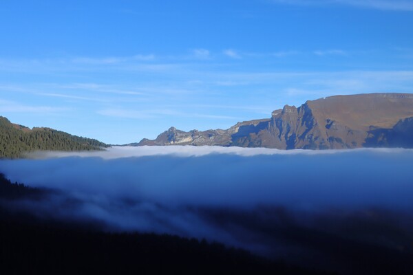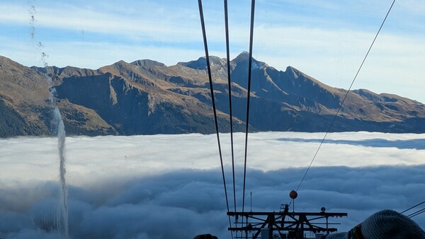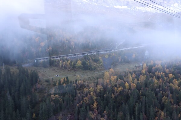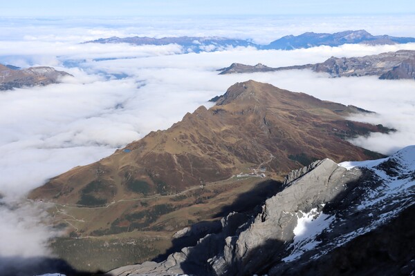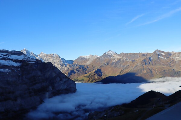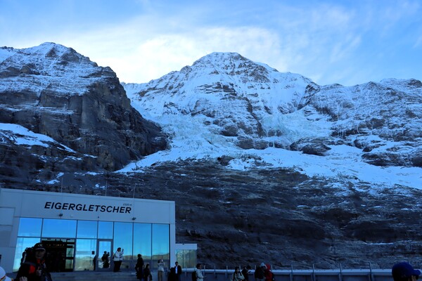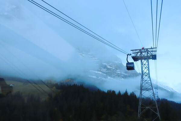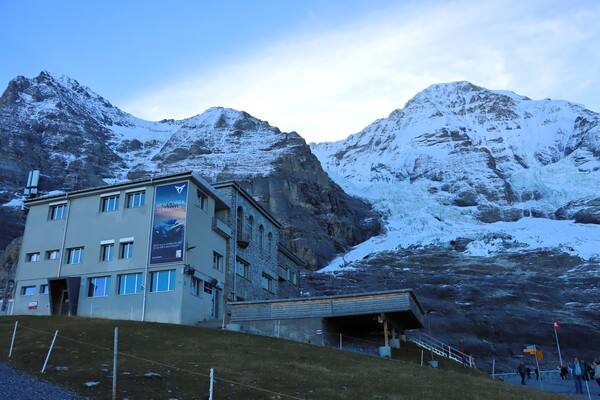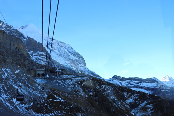 一早天氣有點令人擔憂,雲層圍繞周遭的高山,不知山頂氣象如何? 從Grindelwald車站搭乘 Berner Oberland-bahn的列車下行到下一站 Terminal,這是纜車站、鐵路車站及購物中心的結合體,從這裡搭乘Eiger Express 循環式纜車上到 Eigergletscher 艾格冰河站,八人座的纜車快速地往山上拉升,沒多久就突破雲層,反而變成美麗的雲海風光,陽光斜照在山頂,還沒照入艾格冰河站,此站位於艾格峰(Eiger)跟僧侶峰(Monch)山下,是進入少女峰鐵路的入口站。