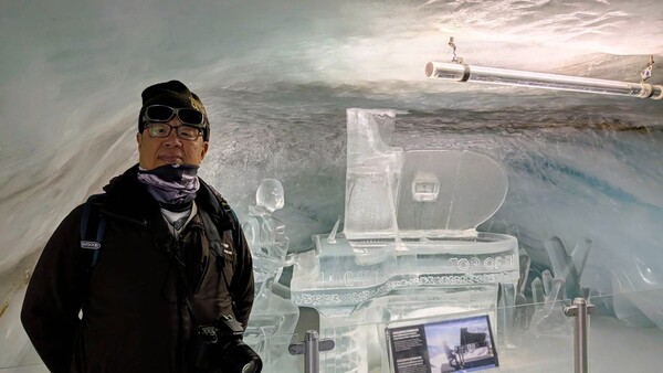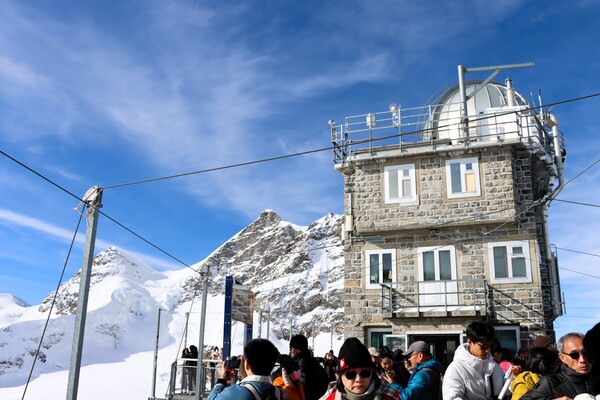 標高3,454m的少女峰山坳 Jungfraujoch 掛上自豪的 Top of Europe 封號,山坳裡的通道連接上層天文台及冰河景觀台,形成複雜的觀光組合,是這趟旅程中最龐大的complex,特別在高山上已經有點dizzy了,很容易就迷亂了方向。搭電梯從Sphinx 天文台的景觀台,到穿過冰宮,再到戶外的景觀平台踏雪,上上下下的,又是室內洞內戶外的,像在走迷宮。