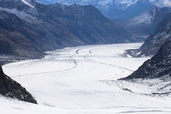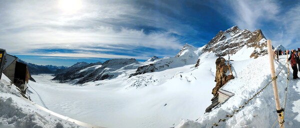 少女峰近在眼前,她本尊並不特別,阿萊奇冰河(Aletschgletscher)的源頭就在少女峰下,Day 5時,我們是在南側的Eggishorn看阿萊奇冰河,經過五天後來到它的源頭,真是壯觀的冰河。今日是雙十節,有台灣團帶國旗來慶賀,我就用兩幅瑞士國旗拼湊成雙十來慶祝國慶日!
