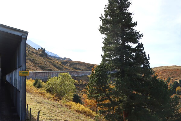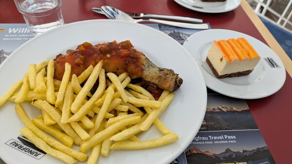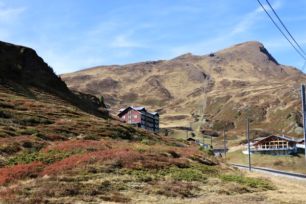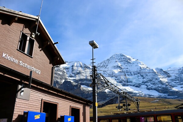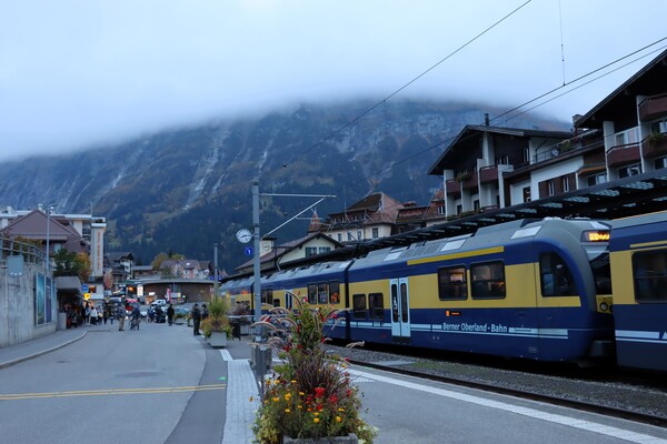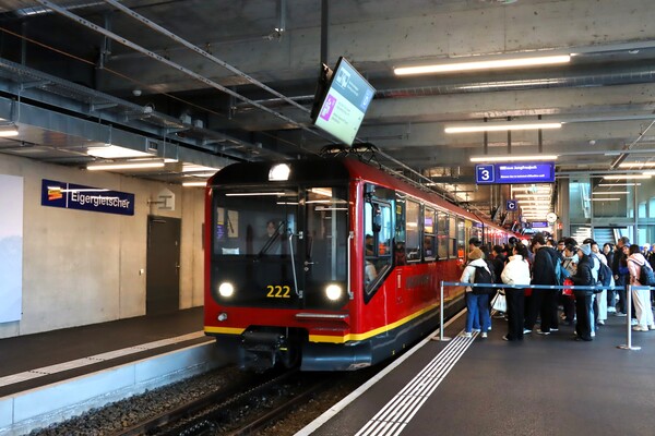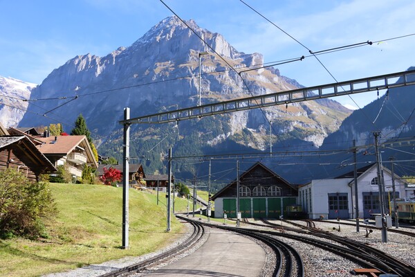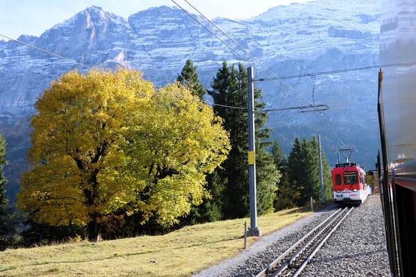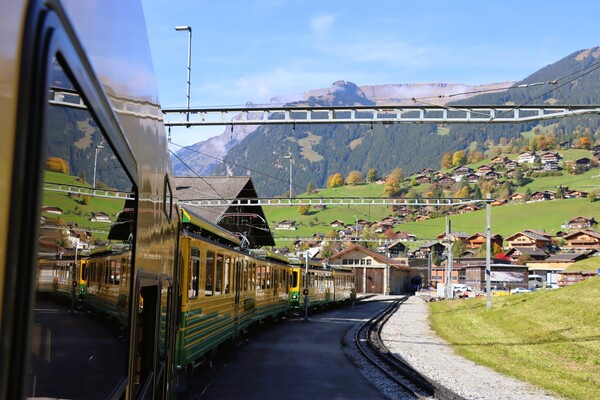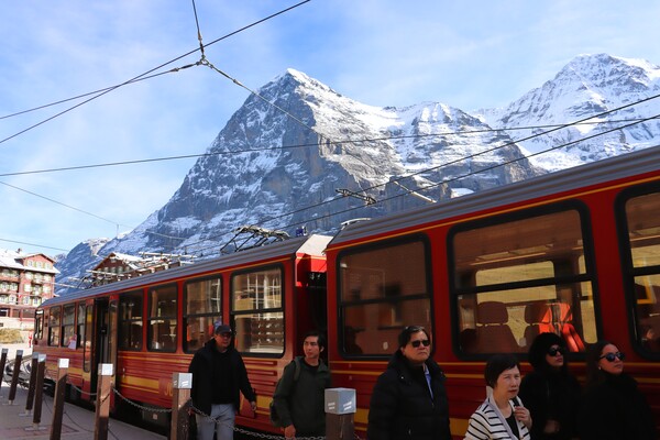> 深紅色的少女峰鐵路列車在此站換搭草綠黃色的文根阿爾卑斯鐵路列車