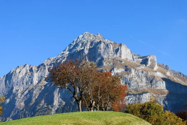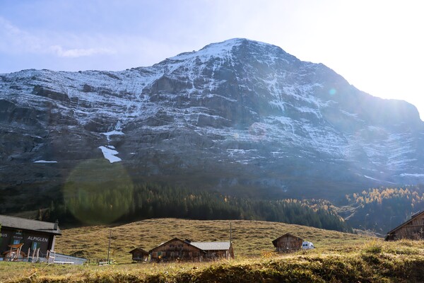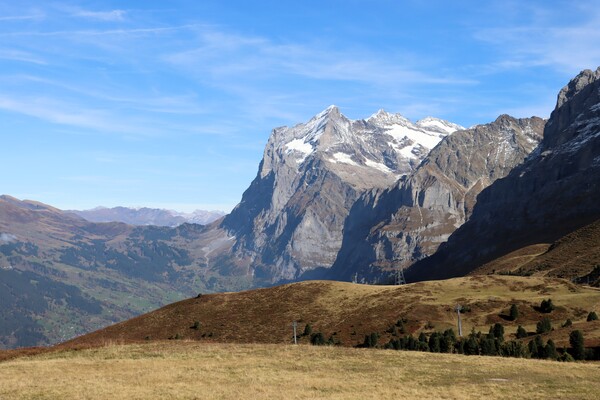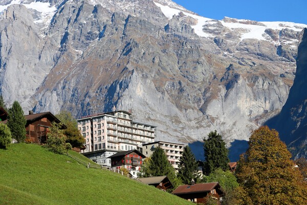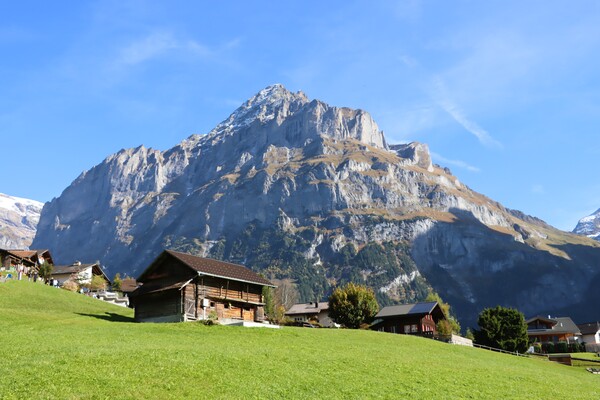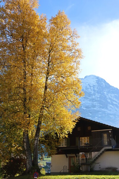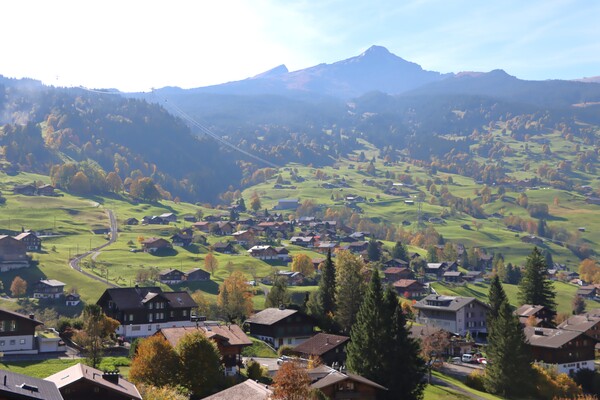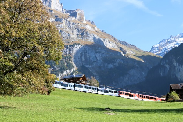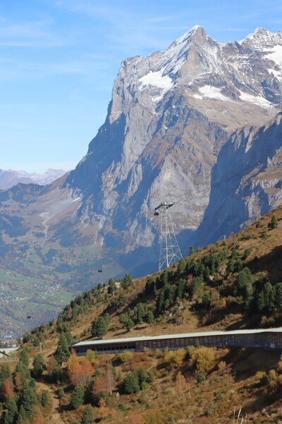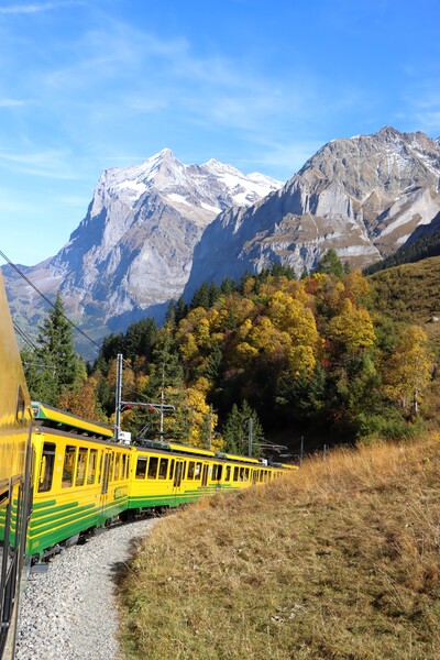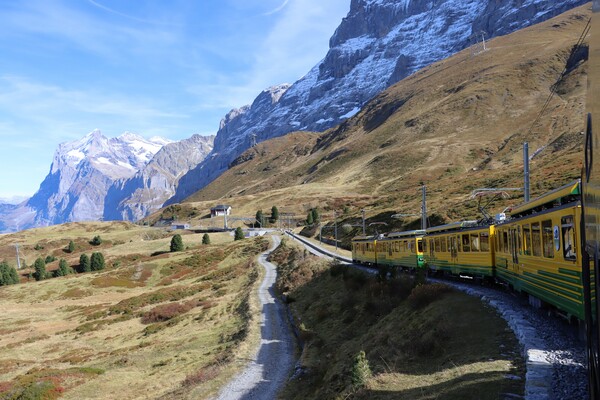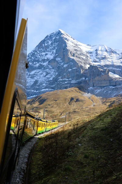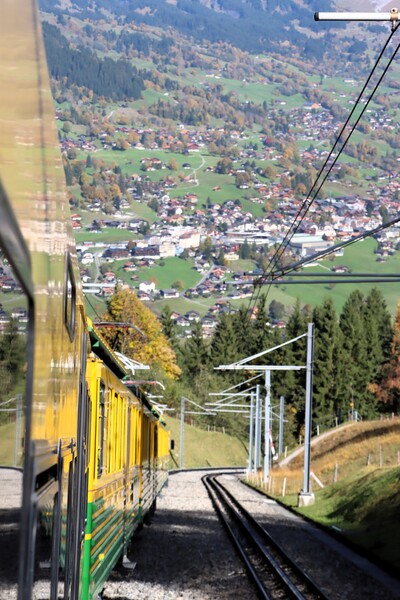 下山走另一條路線,先搭少女峰鐵路穿洞而出到 Kleine Scheidegg 這個分水嶺站轉搭文根阿爾卑斯鐵路(Wengernalpbahn),往左是到Lauterbrunnen,往右是到 Grindelwald,兩處通往少女峰的門戶。回到Grindelwald的鐵道風光非常的美,少女峰列車是暗紅色,文根阿爾卑斯列車是草綠黃色的,行駛在艾格峰及Grindelwald大草原上,是這旅程中最漂亮的一段登山鐵路。