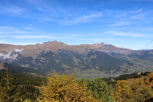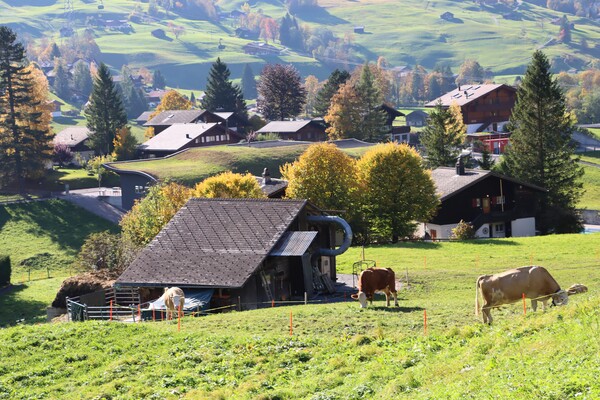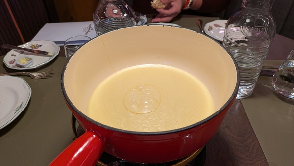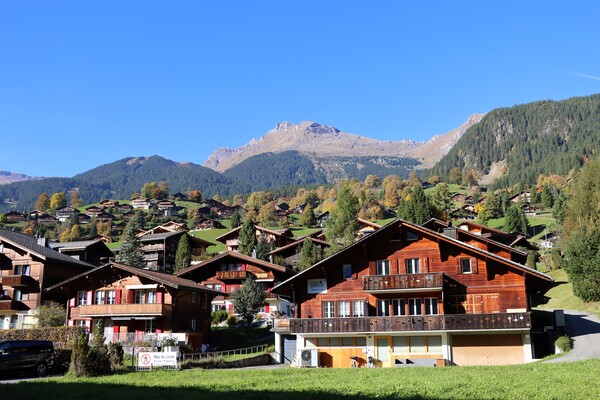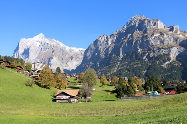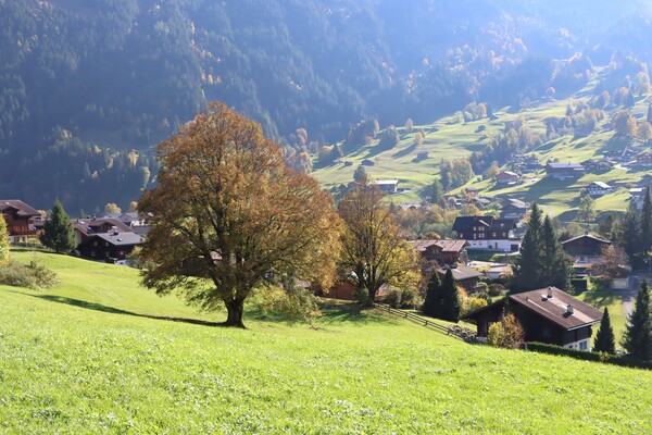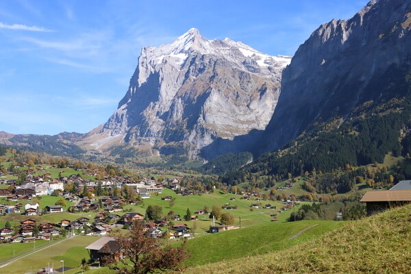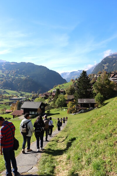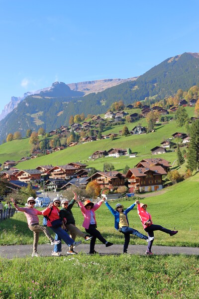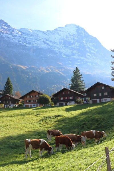 傍晚時刻,導遊號召大家到Grindelwald 大草原散策,散步在農家草牧地的巷弄之間,白靄的高山圍繞這翠綠的山谷,又是秋天的多重顏色,掛著鈴鐺的牛羊悠哉地吃草,有著人生莫過如此享受的感動,步行到Terminal 站搭列車回Grindelwald,晚餐是瑞士著名的起司鍋,麵包及水果沾滾熱的起司吃,別有風味。