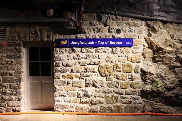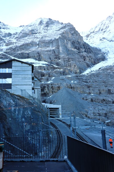 少女峰鐵路 (Jungfraubahn)從艾格冰河站(2,320m)進入隧道,這是偉大的工程建設,打通一個通往少女峰的隧道,長7,122m,要爬升1,130m,從1896年開始建設,到1912年貫穿,原本是要直達少女峰,後修改到少女峰山坳 (Jungfraujoch)相對開闊的地點,山洞內有設一站,此次因技術問題延遲而跳過這處可看冰河的車站,這也是這次旅程中唯一delay的班車,神奇的瑞士鐵道!