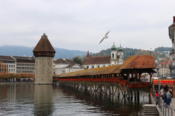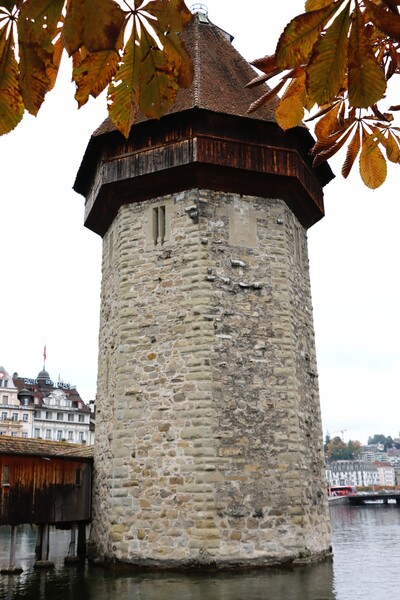 盧森最具代表性的地標是卡貝爾橋 Kapellbruck,建於1333年,位於火車站前Reuss河注入盧森湖處,長204m,原是防禦工事,後因為橋中間有一座聖彼得教堂而成為獨特的建物,在1993年遭遇祝融之災,我在火災前來過兩次,這次是重建後重遊,依然是很獨特的景觀。