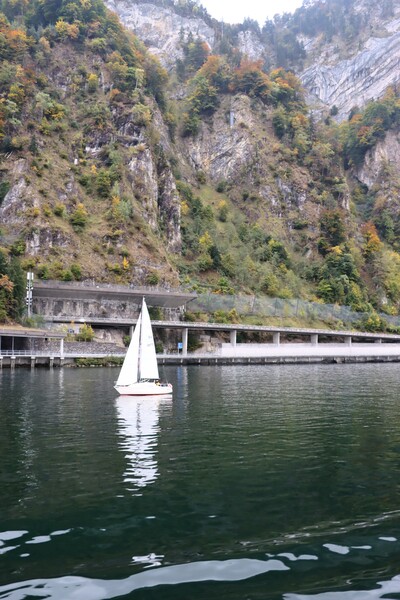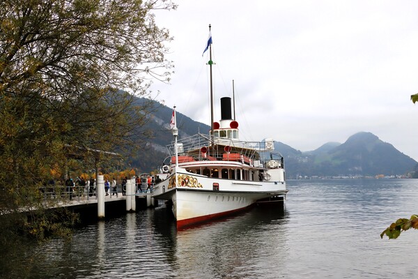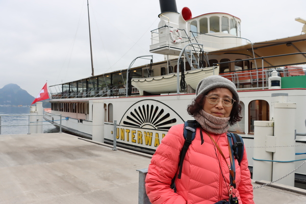 搭乘公車到對岸的碼頭,展開最後一天 Golden Round 的觀光行程,首先是搭船遊湖,Unterwalten汽船,巨大的引擎推動兩側的明輪,坐在頂層的外面,欣賞湖光山色,比預期的冷些,不礙這段將近一小時的行程,在湖的另一端 Alpnachstad 下船,換搭Pilatus 登山列車。