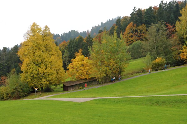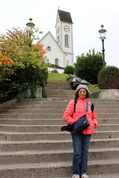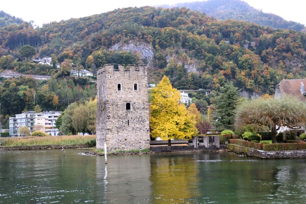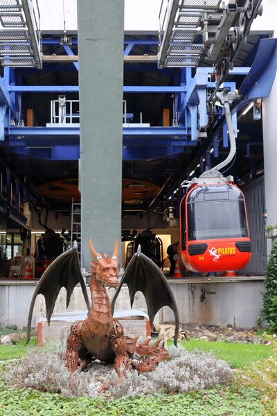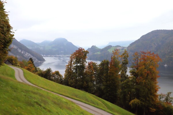 Golden Round Tour 的環狀行程是搭纜車下山,分兩段,前段是大型纜車(gondola),往雲層下降,旁邊有一座孤立的白色小教堂,塑造美麗景觀,太會搞觀光了! 中繼站 Fräkmüntegg 是原野遊樂場的站點,可惜卡在雲霧中,看不清楚有甚麼刺激好玩的運動。第二段纜車是循環式的纜車(cable car),下到雲層下後,途經秋意盎然的山坡,到達盧森郊區的Kriens,在這兒兌換了一頂Pilatus 帽子,步行下去街邊搭公車到市區。