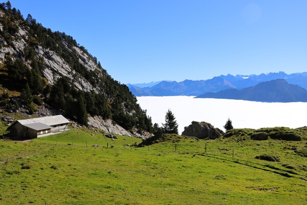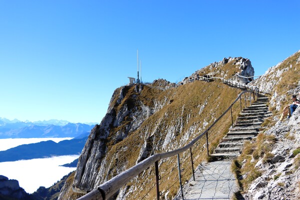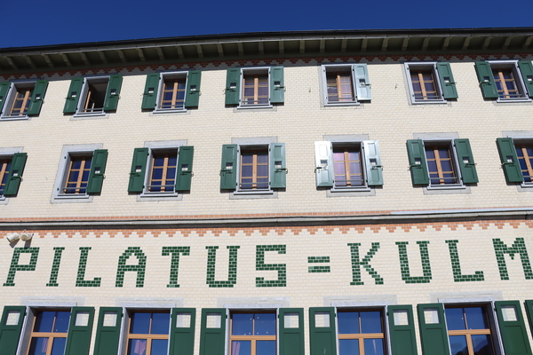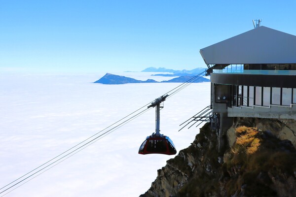 在Alpnachstad 搭乘全世界最陡的齒軌列車 Pilatus Bahn 上到 Pilatus-Kulm,要在4.6km的路程爬升1,635m的高度,最大坡度48度,平均38度,真是驚人的爬坡能力! 車廂也跟著坡度成斜高式設計,約半小時的車程,在半途突破雲層,下面的盧森湖隱蔽到雲海底下,山上一片晴空,晴天娃娃在最後一天仍然有效!