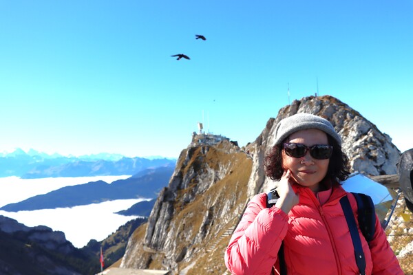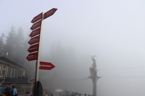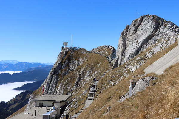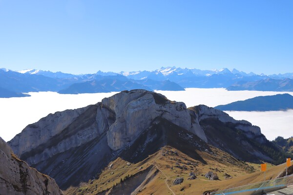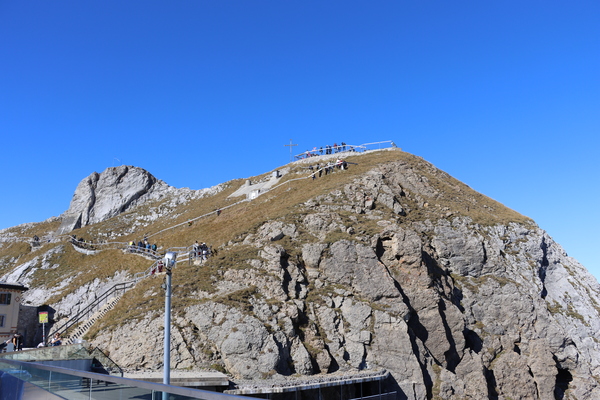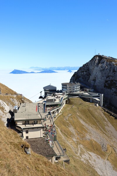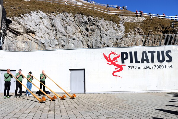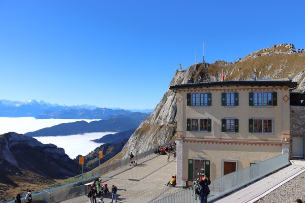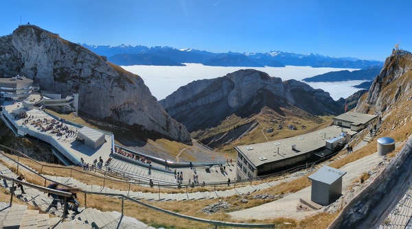 Pilatus Kulm 皮拉圖斯山頂,除了車站纜車站主體建物外,有兩處大的觀景台,分立於館場外的兩側山上,抵達時,剛好有阿爾卑斯長號的表演,四位男士吹響山谷,加上好天氣,雲海風光,心曠神怡。登上一側觀景台,立於雲海之上,一眼望去白茫茫,遠處高山白頭,近處偶有山峰突出雲層,Pilatus是這次參訪的名山中最低的一處,2132m,平台卻是最寬闊好走的一處。