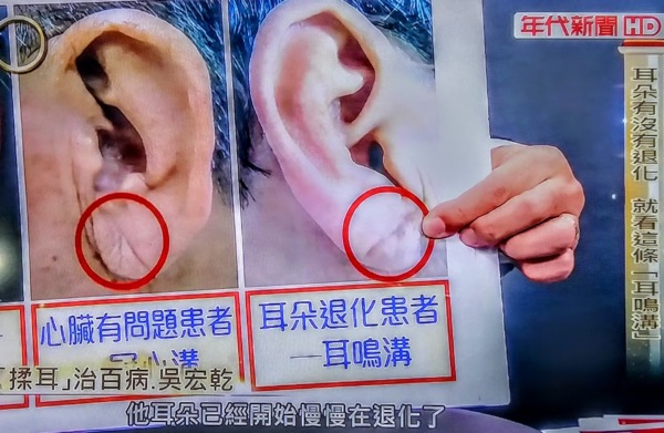 四、45歲以上有胸痛與其他可疑症狀者,如果出現耳垂折痕,則患有冠狀動脈硬化的可能性達90%。