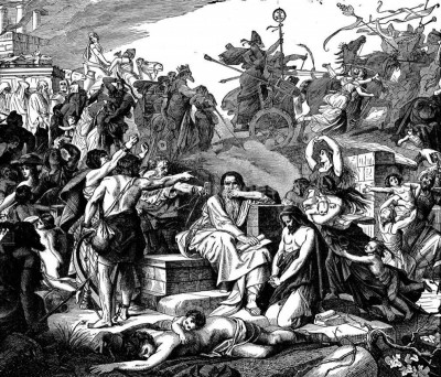 但根本沒有人聽,雅典娜神廟瞬間變成修羅場,有些叛亂者躲在神像後面忒忒發抖,被拉出來一刀劈死,另一些人逃到復仇女神的神廟裡,緊緊抱住神像,但也躲不過被殺掉的命運;而好不容易逃到聖地之外的,則被群眾用石頭活活砸死。滿地到處積著血水,人們踩過,濺在神像上緩緩流下。