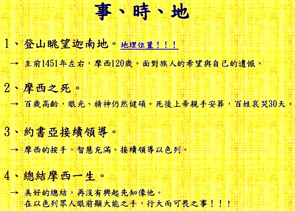 最後的40年他全心帶領以色列人,離開埃及的奴役,往神應許賜給亞伯拉罕及其後裔(創十二1-3)的地方去。