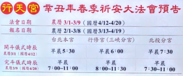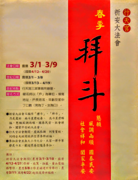 建議多吃一餐飯,多走一段路,多拜一間廟,或有新氣象,甚至見到老朋友....拜斗是道教獨有一種為人消災解厄、祈福延壽之科儀、應稱為『朝真禮斗』。昨天去捷運松江南京站走往長春路,聽海外房地產課程後,又走去行天宮拜拜,發現有祈安大法會(陽曆4/12~4/20,農曆3/1~3/9),及看到說明 "一家一斗,拜斗不分大小斗,隨喜奉獻" 感覺很歡喜,想說捐個三百元;結果單子寫完,就繳款三百元登記中,又發現有"祭煞,蓋魂.."等等道教各式各樣去霉運法事就問登記處,參加費用如何?結果回答"一切免費~!".想想又是隨喜..