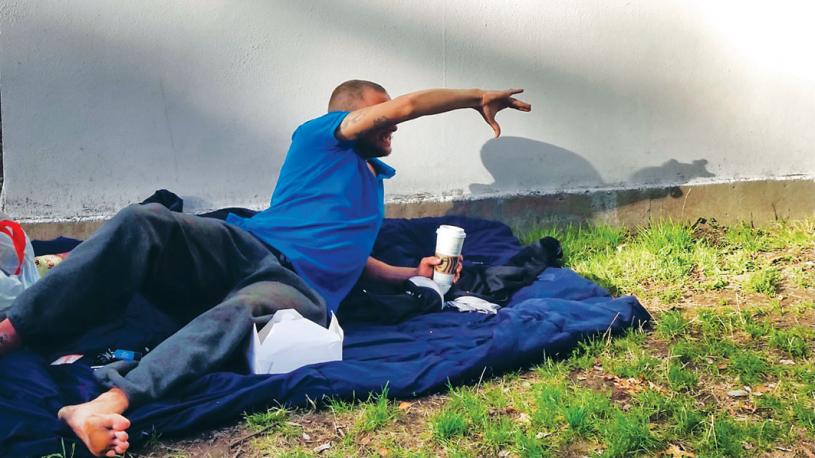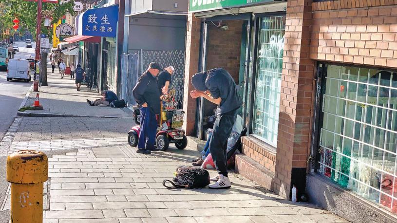 無家可歸者入侵溫市華埠早非新聞。但在片打東街當街打針,實在有損市容。 星島記者攝