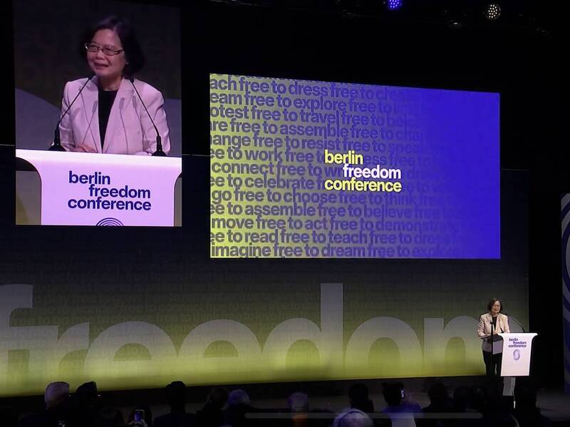 蔡英文指出,「柏林自由週」紀念1989年11月9日柏林圍牆的倒塌,至今這段歷史依然是民主戰勝威權最鮮明的象徵,蘇聯解體是歷史上一大轉捩點,讓自由在東歐及更廣大的地區綻放,台灣也受此激勵努力邁向民主世界,從數十年的威權統治,堅持不懈地走向1996年首次總統直選,開啟了民主鞏固的時代,如今被公認為全球最自由、最有活力的民主國家之一。
