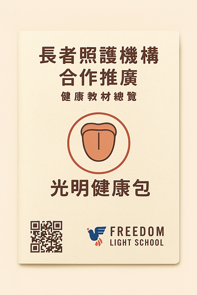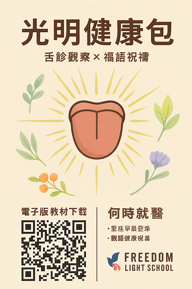 | 頁首區 | 標題:「光明健康包」 副標:「舌診觀察 × 福語祝禱」 Freedom Light School 標誌 | 米色底、光暈背景、標題居中、字體溫潤 |