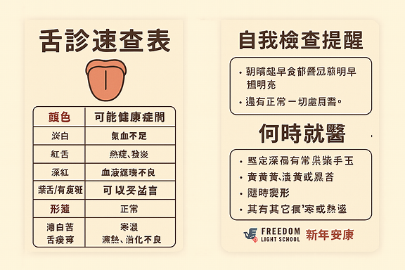 要不要我幫你把這份表格 設計成一張視覺化的「舌診速查圖」,像健康檢查海報一樣,方便你在 Freedom Light School 或日常聚會中展示呢?
