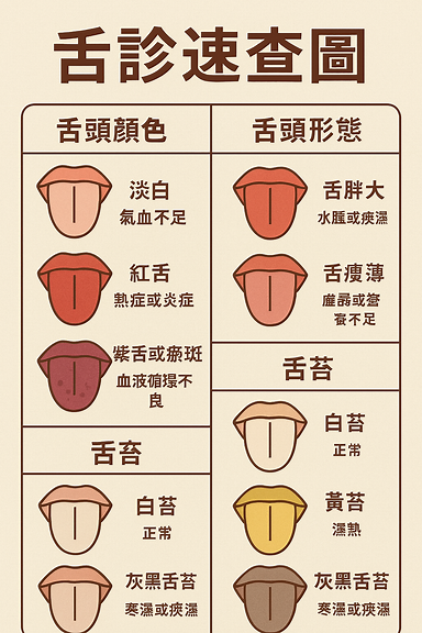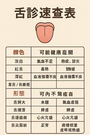 圖像設計:小型舌頭圖示 + 對應健康提示(如「紅舌=熱症」)
