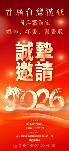 今年有AI春聯了!誠摯邀請/首屆台灣漢紙兩岸藝術家:春聯,年畫,漫畫月展/2026年02月06日至03月06日地點/台北市松山區八德路四段321號一樓:諮詢電話0981693143張小姐