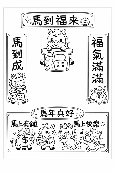 下面我幫你設計 「有趣・吉祥・福氣」且「容易手繪複製」的【馬年春聯】+【年畫】構想,線條簡單、適合手繪或大量複製,你可直接照畫或再微調。
