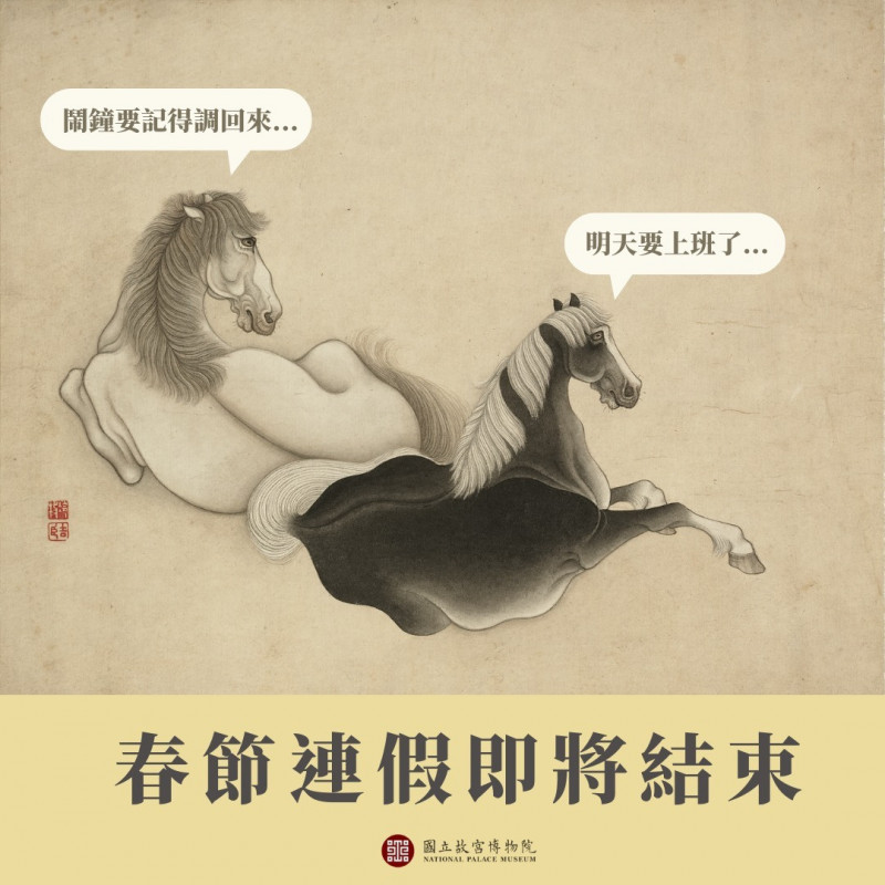 故宮以〈清 冷枚畫馬〉提醒春節就要結束,記得明天上班要調鬧鐘。(翻攝自故宮臉書)