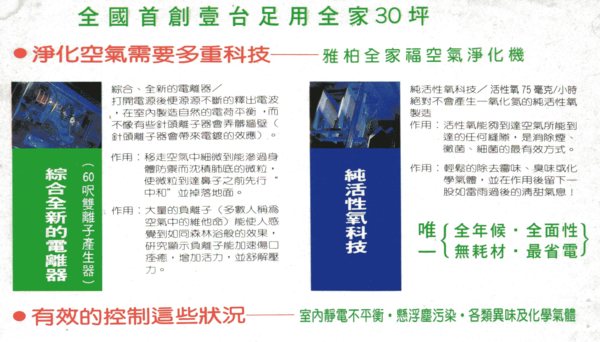 1.能使灰塵比平常下降速度快四倍,若冷氣房密閉空間,不間斷使用,甚至於在陽光照射下,不會見到飄浮物,應是目前市場唯一能改善密閉空間懸浮微粒的利器良策.