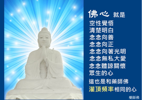 但是我們凡夫仍然是搖擺不定。這尊藥師佛非常疼惜我們、關心我們,祂為我們灌頂,給我們希望、幸福、健康、順心吉祥。我們用佛心的密碼和佛心的頻率,就與藥師佛的灌頂頻率相應,這樣那些魔邪鬼怪不敢干擾我們,這樣我們自己的佛心光明出來了,這種修行才是真的。