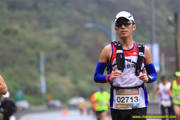 這場萬金石依照以往的慣例,在風很大又下雨中進行,我把今天的配速目標寫在手上,每10K、25K、35K檢查,在3K時遇到了同事ERIC,問我今日如何配速,我回答,前5K及後7K跑6分,其它5’30”開到底,在約5K後要進入加投路及獅頭山的爬坡時遇到的俊傑哥(他超好相認的),和他一起跑了一小段,聊了一下之後請他先跑,和他說我前面會跑慢一點,依自己的計劃來跑(5’30”/K),不過他一直都在我前方不遠處,因跑速一直都差不多,直到27K左右,我又和俊傑相遇,再聊了一下,我就慢慢跑走,因我想他後面一定會追上來的,最後的爬坡用高步頻克服了,那時約35K,檢查點快了8MIN,我想今天可能可以SUB4,不過還是不能大意,穩定前進,配六分順順跑完就行,只是最後在隧道前及隧道中各走了一小段(約100M~200M),但心想不能因此放棄,看到光線時,就知道要衝了。