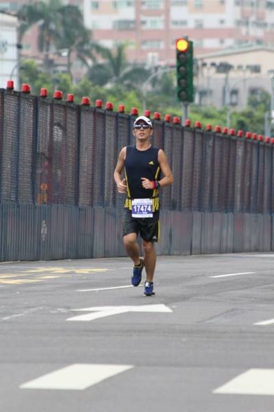 過了前段四分半的配速,就自動降到4’50”/K,獨自在跑步,因沒帶水,所以每個水站都要進去才行,一直維持到10K的LAP響起,立馬跌出五分正,之後在新北環快道路上,怎麼重新整裝,就是跑不進去,第二折返後約13K~15K,我就像落隊的人一樣,前面一群跑者跑在一起,我就一個人在後面一直追,但也沒辦法加入他們的行列,曾經很失望的想停下來休息一下,但停下來就對不起給我號碼布的朋友,一想到這就決定,過了最後一個補給站,剩2.5K時,我就要燃燒自己,加速到終點。