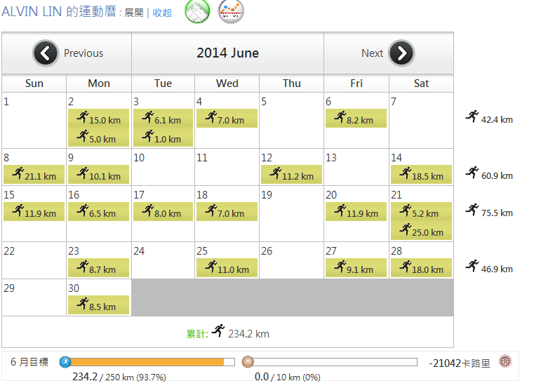 六月份沒什麼大的路跑活動,本來只有一場星光馬25K,但月初因有好心人,多了一場半馬,不過夏天跑起來好累喔,而且又容易掉速,還是把路跑活動拿來當練習好了,因方便補給^^。 跑步:這...